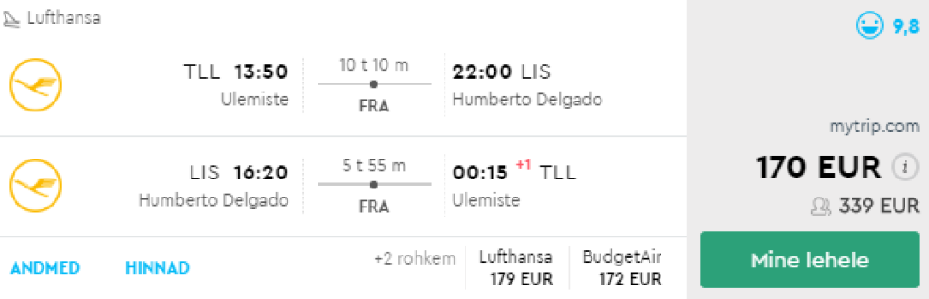 Lufthansa pakub hetkel väga hea hinnaga lennupileteid suvepikenduseks Tallinnast Lissaboni. Edasi-tagasi lennupiletid on saadaval alates 170€ eest ning saadavus on alates oktoobri lõpust kuni maini 2019. Lennud on ühe ümberistumisega Frankfurdi lennujaamas. Parima hinnaga lennupiletid leiad üles läbi Momondo.ee.