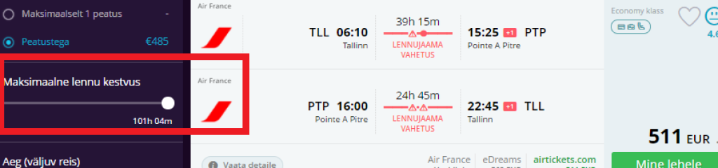 NB: kõikide väljatoodud näidiskuupäevade puhul on olemas mugavate ümberistumistega variant, mille puhul pole vajalik lennujaamavahetus Pariisis. Mugavaimate ümberistumiste ülesleidmiseks optimeeri lennuaegu nagu näidatud alloleval pildil:
