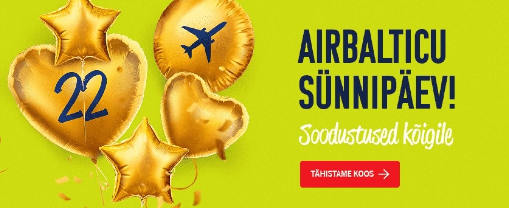 AirBaltic pakub oma 22 sünnipäeva puhul lendudele 22€ suurust soodustust. Selleks tuleb AirBalticu kodulehel lendu broneerides sisestada sooduskood HAPPY22.