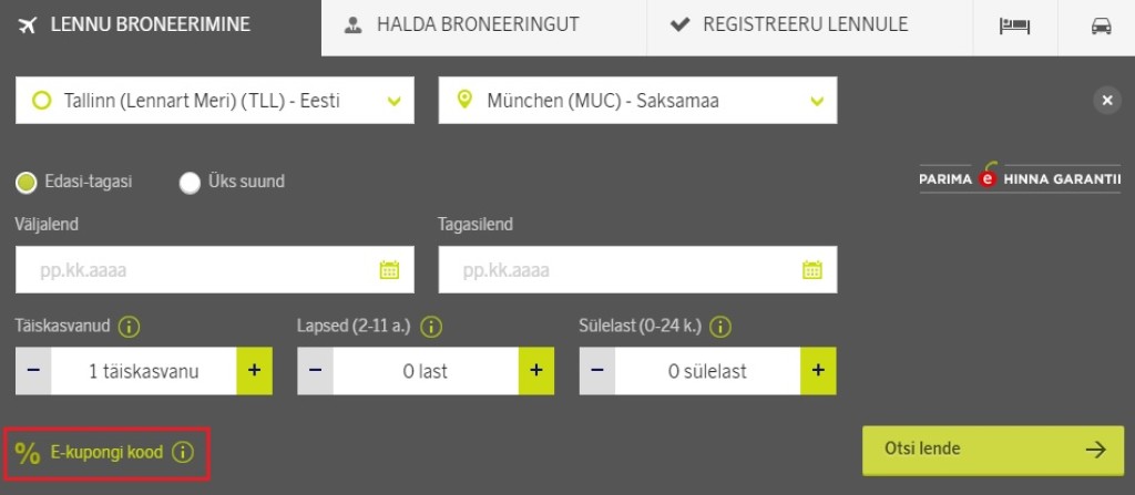 - Koodi HAPPY22 saab kasutada, kui AirBalticu kodulehel piletite broneerimist alustades sisestada e-voucheri kasti. Järgmisel lehel näeb allahindlust.