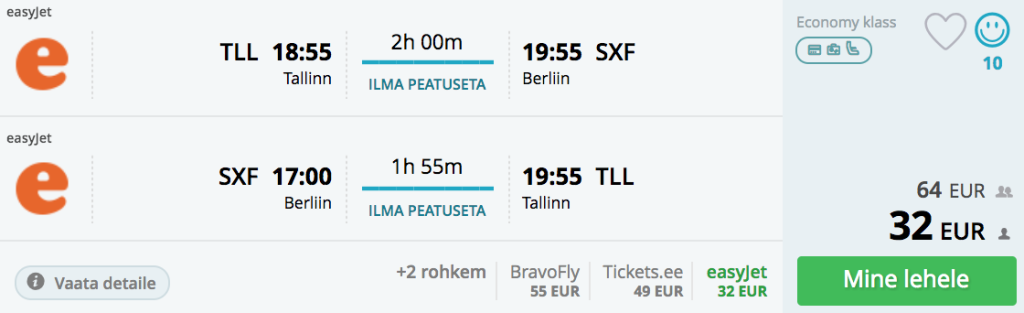 Easyjet pakub hetkel väga soodsaid lennupileteid otselendudele Tallinnast Berliini. Kõige soodsam on lennata neljakesti, sel juhul on edasi-tagasi lennupiletite hind ühele vaid 27€, kahekesi reisides on hind 32€. Saadaval lai valik lennukuupäevi novembrist kuni veebruarini ning tõime välja ka parima hinnaga lennupiletid veetmaks jõulud, aastavahetus või sõbrapäev Berliinis. Soodsad lennupiletid leiad üles läbi momondo või kasutades otselinke allpool. Lennud toimuvad teisipäeviti ning laupäeviti.