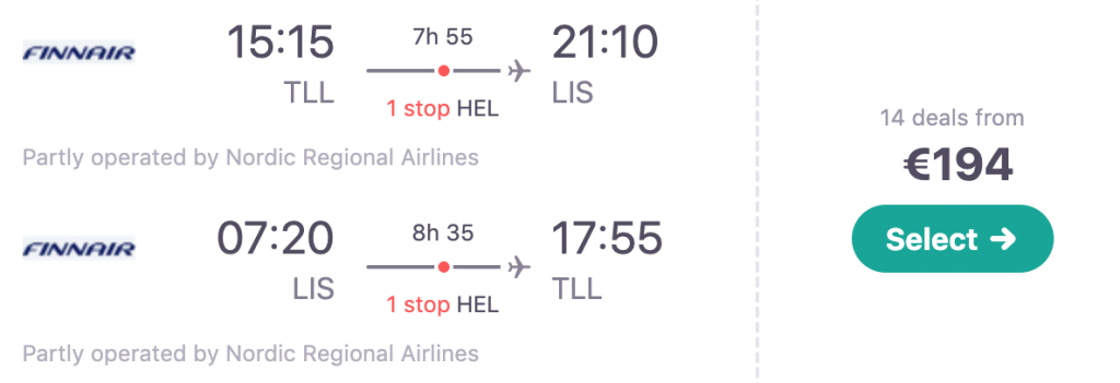 Finnair pakub hetkel hea hinnaga lennupileteid Portugali. Edasi-tagasi lennupiletid Tallinnast Lissaboni on saadaval alates 194€ eest ning soodsa hinnaga lennupileteid leiab novembri algusest kuni 2020 aasta augustini välja. Lennud on mõlemal suunal ühe ümberistumisega Helsingis. Parima hinnaga lennupiletid leiad üles läbi Skyscanneri