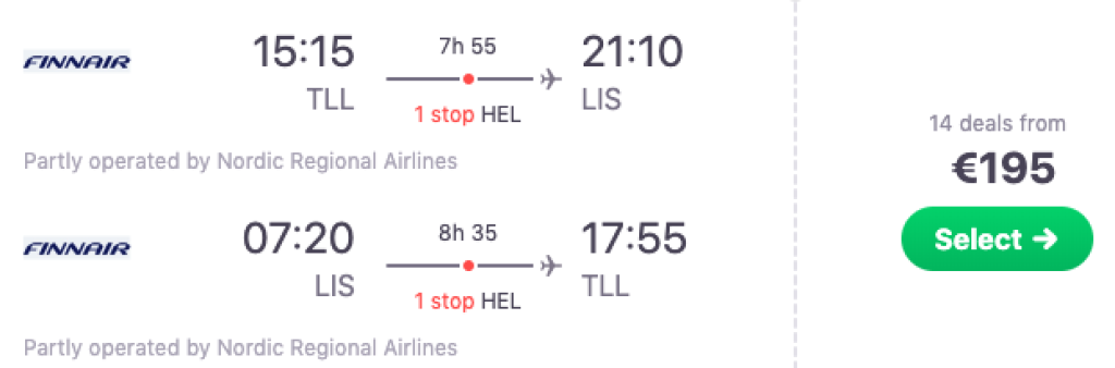 Soome lennufirmaFinnair pakub hetkel hea hinnaga lennupileteid Portugali. Edasi-tagasi lennupiletid Tallinnast Lissaboni on saadaval alates 195€ eest ning soodsa hinnaga lennupileteid leiab oktoobri algusest kuni 2020 aasta augustini välja. Lennud on mõlemal suunal ühe ümberistumisega Helsingis. Parima hinnaga lennupiletid leiad üles läbi Skyscanneri