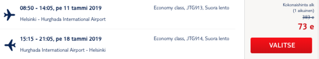 Soome reisikorraldaja TUI kodulehelt leiad hetkel väga hea hinnaga viimase hetke lennupileteid otselendudele Helsingist Egiptuse rannakuurorti Hurghadasse. Lennupiletid on saadaval nädalasteks puhkuseks jaanuaris. Otsisime välja ka mõned hotellipakkumised ning kombineerides lennupiletid Helsingist ja nädalase hotellipakkumise hotellis Royal Star Beach Resort Hurghada saab lennupiletid ja öömaja koos toitlustamisega kätte vaid 176€ eest.