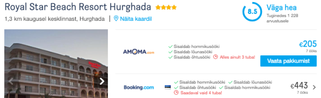 HotellipakkumisedParima hinnaga majutuse leiad üles otsides läbi hotellihindade võrdlusportaali Hotelscombined.ee. Toome välja ka mõned pakkumised nädalaseks puhkuseks Hurghadas vahemikus 11.01-18.01.