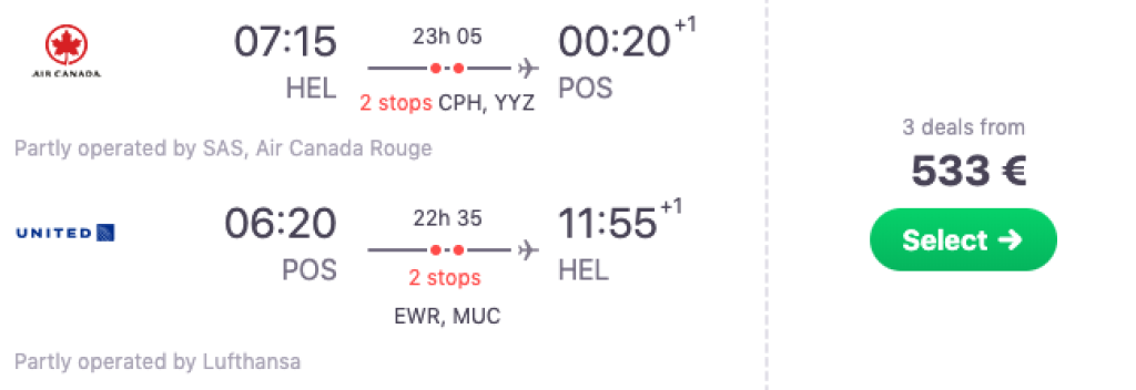 Star Alliance'i lennufirmad (Lufthansa, SAS, Air Canada, United) pakuvad hetkel väga hea hinnaga lennupileteid sügiseks ja talveks Helsingist Trinidadi saarele. Edasi-tagasi lennupiletid Helsingist Port of Spaini leiab üles alates 533€ eest ning saadaval on soodsaid kuupäevi oktoobrist kuni aprillini. Lennupiletite hinna sees on nii äraantav pagas kui toitlustamine lennufirmade pardal. Lennupiletite ostmiseks kliki allpool olevatel näidiskuupäevadel või otsi endale sobivad lennupiletid üles läbi Skyscanneri