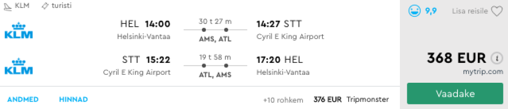 KLM ja Delta pakuvad hetkel väga soodsaid lennupileteid Helsingist USA Neitsisaartele. Edasi-tagasi piletite hinnad Helsingist Saint Thomasesse on saadaval alates 368€ ning saadavust on ohtralt alates novembrist kuni märtsi keskpaigani välja. Lennud toimuvad üle Amsterdami ja Atlanta/New Yorgi. Minnes on tulenevalt lennuplaanist pikem peatus ja ööbimine Atlantas. Parima hinnaga lennupiletid leiad üles läbi Momondo.eeNB! Piletid on reisimiseks ainult käsipagasiga (kuni 12 kg) + arvutikott.