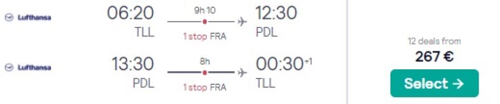 Lufthansa pakub hetkel väga hea hinnaga lennupileteid juulis Assoori saartele. Edasi-tagasi lennupiletid Tallinnast Ponta Delgadasse on saadaval alates 267€ eest. Soodsaimad lennupiletid leiab üles läbi Skyscanneri või kliki allolevatel näidiskuupäevadel.