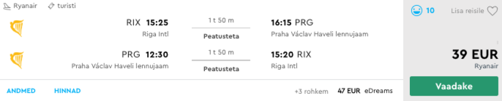 Ryanair pakub hetkel hea hinnaga lennupileteid otselendudele Riiast Prahasse. Soodsaimad edasi-tagasi lennupiletid on saadaval alates 39€ eest. Hea hinnaga lennupileteid leiab kevadeks ja suveks. Ryanairi lennud Riia ja Praha vahel toimuvad 3x nädalas - teisipäeviti, neljapäeviti ja laupäeviti. Soodsate lennupiletiteni jõudmiseks kliki allolevatel lennukuupäevadel või kontrolli endale sobivaid läbi Momondo.ee