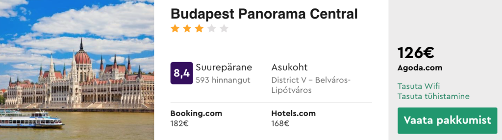 Toome välja ka näidispakkumise hea hinnaga hotellipakkumisest veetmaks Budapestis pikk nädalavahetus. Valisime näidiskuupäevadeks 08.10-11.10, sarnase hinnaga pakkumisi leiab ka teisteks kuupäevadeks.