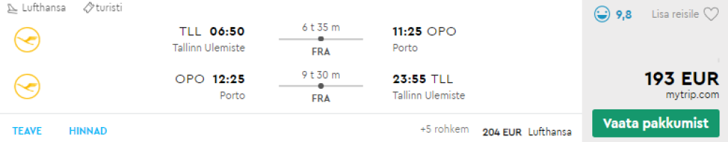 Lufthansa pakub hetkel hea hinnaga lennupileteid Tallinnast Portosse. Edasi-tagasi lennupiletid on saadaval al 193€ eest ning saadavust on detsembrist märtsini. Hea hinnaga lennupiletid on saadaval ka veetmaks pikk nädalavahetus Portos. Lennud on mõlemal suunal ühe ümberistumisega Frankfurdis. Parima hinnaga lennupiletid leiad üles läbi momondo.ee