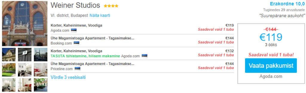 Budapesti hotellidKui otsid soodsa hinnaga öömaja, siis soovitame parima ülevaate ja hinna saamiseks kasutada hotellihindade võrdlusportaali Hotelscombined.ee. Järgnevalt näide soodsast hotellitoast Budapestis vahemikus 24.01-27.01 (3 ööd N-P). Sobivad lennupiletid leiad allolevate näidiskuupäevade hulgast.