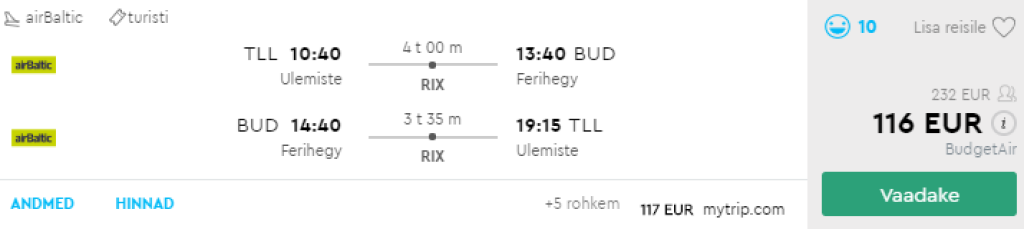 airBaltic pakub hetkel väga hea hinnaga lennupileteid Tallinnast Ungari pealinna Budapesti. Edasi-tagasi lennupiletid on saadaval vaid 116€ eest. Soodsa hinnaga kuupäevi leidub ka veetmaks Budapestis pikk nädalavahetus (N-P). Saadavust leiab alates jaanuarist märtsini.Tõime välja mõned näidiskuupäevad, saadaval on ka teisi lennukuupäevi. Parima hinnaga lennupiletid leiad üles läbi momondo.ee