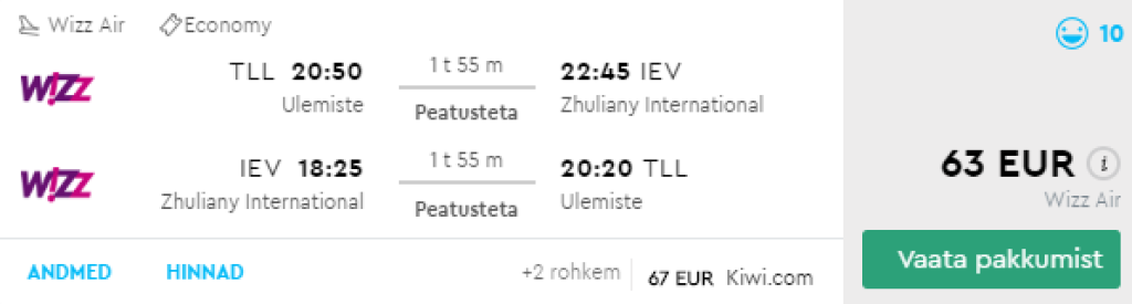 Hetkel leidub väga hea hinnaga lennupileteid Wizzairiga Tallinnast Kiievisse. Edasi-tagasi lennupiletid saab kätte al 63€ eest. Tegemist on otselendudega. Soodsa hinnaga lennupiletid on saadaval nädalavahetusteks (R-E) novembrist veebruarini.Piletiteni jõudmiseks kasuta otselinke allpool või otsi lennupiletid üles läbi momondo.ee.