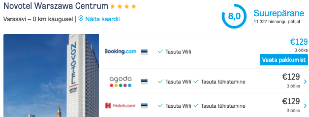 ####VEEDA PIKK NÄDALAVAHETUS VARSSAVISToome välja ka näidispakkumise veetmaks pikk nädalavahetus Varssavis. Tegemist on näidispakkumisega, sarnase hinnaga majutust leiab ka teisteks kuupäevadeks.Kui otsid soodsa hinnaga öömaja, siis soovitame parima ülevaate ja hinna saamiseks kasutada hotellihindade võrdlusportaali HotelsCombined.ee. Hetkel on hotellihinnad Varssavis juuliks ja augustiks väga magusate hindadega!
