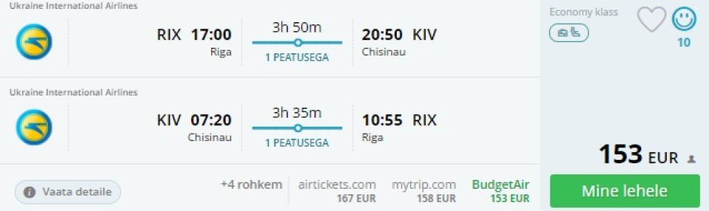 UIA pakub hetkel suurepärase hinnaga lennupileteid Riiast Moldovasse. Edasi-tagasi lennupiletid Chisinausse on saadaval alates 153€ eest.Soodsaid lennukuupäevi leidub mais-juunis. Enamike lennukuupäevade puhul on võimalik valida ka tagasiteel pikem peatus Kiievis, kui on soovi linnaga tutvuda.Piletiteni jõudmiseks kasuta otselinke allpool või otsi lennupiletid üles läbi Momondo.ee.