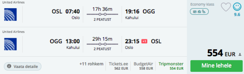 Oslo-Kahului (Maui saar) -Oslo alates 546€Leidub erinevate ümberistumistega lende. Tihtipeale on kiirete ümberistumistega lennud vaid mõnevõrra kallimad.