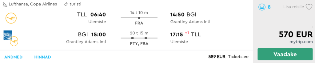 Lufthansa pakub hetkel väga hea hinnaga lennupileteid Barbadosele. Edasi-tagasi lennupiletid Tallinnast Bridgetowni on saadaval alates 570€ eest ning saadavus on väga hea alates oktoobri lõpust kuni aprilli alguseni välja. Lennupiletite hinna sees on nii toitlustamine lennufirmade pardal kui ka äraantav pagas. Piletiteni jõudmiseks kliki allolevatel näidiskuupäevadel või kontrolli endale sobivaid kuupäevi läbi Momondo.ee