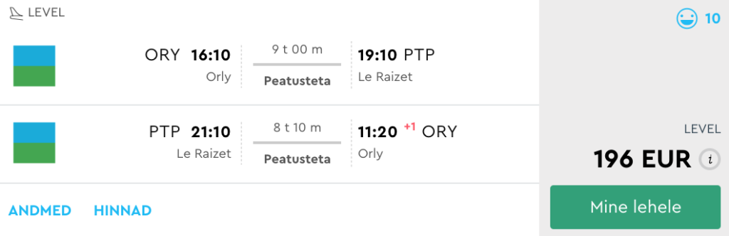 Lennupiletid marsruudil Tallinn-Pariis-TallinnTuleb tähele panna, et lend Guadeloupele toimub Orly lennujaamast kell 4PM ning Martiniquele 3PM, seega tuleb valida võimalikult varane lend Pariisi, et jõuaks vahetada lennujaama. Tagasilend jõuab Pariisi ennelõunal, seega jõuab ilusti mõne hilislõunase lennuga tagasi Tallinna. Parima hinnaga lennupiletid Tallinnast Pariisi leiad üles läbi Momondo.ee