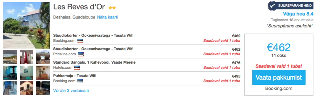 Hotellipakkumised GuadeloupelHea hinnaga majutuse leiad läbi hotellihindade võrdlusportaali Hotelscombined.ee.Toome välja näidispakkumise kuupäevavahemikuks 03.10-14.10.