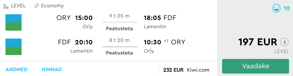 Lennupiletid marsruudil Tallinn-Pariis-TallinnTuleb tähele panna, et lend Guadeloupele toimub Orly lennujaamast kell 4PM ning Martiniquele 3PM, seega tuleb valida võimalikult varane lend Pariisi, et jõuaks vahetada lennujaama. Tagasilend jõuab Pariisi ennelõunal, seega jõuab ilusti mõne hilislõunase lennuga tagasi Tallinna. Parima hinnaga lennupiletid Tallinnast Pariisi leiad üles läbi Momondo.ee