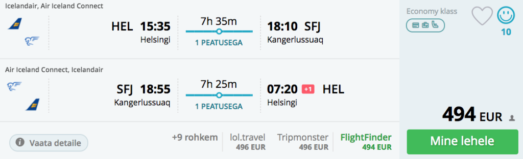 Hetkel pakub Icelandair koostöös Iceland Connectiga lennupileteid Helsingist Kangerlussuaqi. Lennud toimuvad üle Reykjaviki ning lennupiletite hinnad on alla 500€. Saadavust on augustis, mis on ka parim aeg Gröönimaa külastamiseks.Infoks niipalju, et augustis on Gröönimaal aktuaalne ka polaarpäeva esinemine. Soodsaid lennupileteid võib leida ka Stockholmist. Parima hinnaga lennupiletid leiad üles läbi Momondo