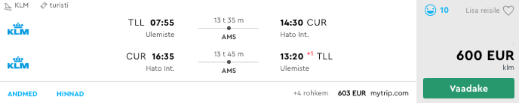 KLM/Air France pakuvad hetkel väga hea hinnaga lennupileteid Tallinnast Curacaole. Edasi-tagasi lennupiletid Tallinnast Curacaole on saadaval 600€ eest ning hea hinnaga lennupileteid leiab alates augustist kuni 2020 aasta märtsi lõpuni. Lennud on enamjaolt mõlemal suunal ühe kiire ümberistumisega Amsterdami lennujaamas. Lennupiletite ostmiseks kliki allpool olevatel näidiskuupäevadel või otsi endale sobivaid lennukuupäevi läbi Momondo.ee