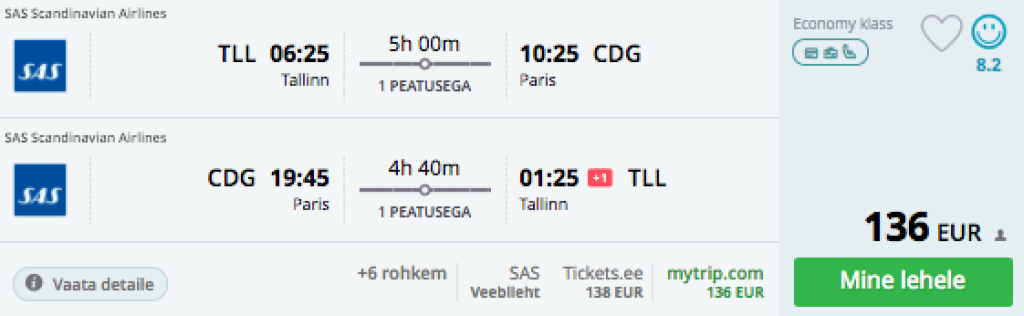 Tallinn-Pariis-Tallinn 136€Lennupiletite broneerimisel Tallinnast Pariisi tuleb vaadata kindlasti, et jääks piisavalt aega vahetada mõlemal suunal lennujaama. Parima hinnaga lennupiletid leiab üles läbi Momondo.ee