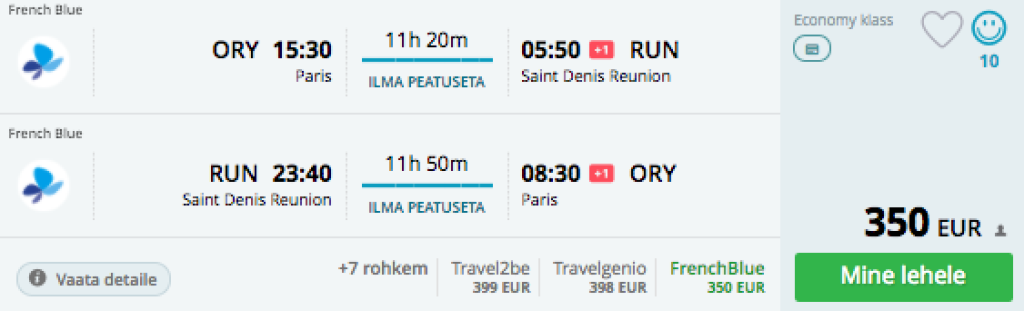 Kaks lennufirmat pakuvad hetkel väga hea hinnaga lennupileteid Pariisist Reunioni saarele. Soodsaimad edasi-tagasi lennupiletid Pariisist Reunionile on saadaval vaid 350€ eest! Kombineerides need lennupiletitega Tallinnast Pariisi saab lennupiletite maksumuseks Tallinnast Reunionile vaid .