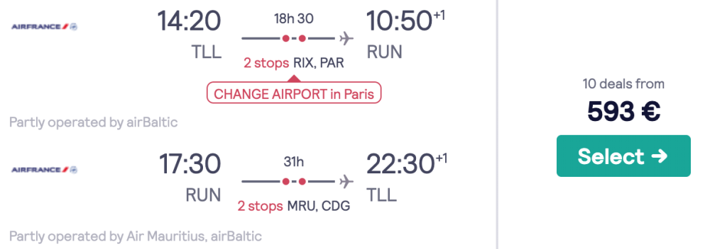 Air France koostöös airBalticu, Finnairi ning Air Mauritiusega pakuvad hetkel väga hea hinnaga lennupileteid Réunioni saarele. Edasi-tagasi lennupiletid Tallinnast St. Denisi on saadaval alates 593€ eest. Vähemalt ühel suunal tuleb vahetada Pariisis ka lennujaama (lennud Reunioninile (RUN) toimuvad Orly lennujaamast ja lend Tallinnast toimub CDG-st) ning lennujaamatransfer Air France-ga lendajatele on tasuta. Info lennujaama vahetuse kohta leiab SIIT. Lennupiletite hinna sees on nii äraantav pagas kui toitlustamine pardal. Soodsa hinnaga lennupileteid leiab alates jaanuarist kuni 2020 aasta oktoobrini.