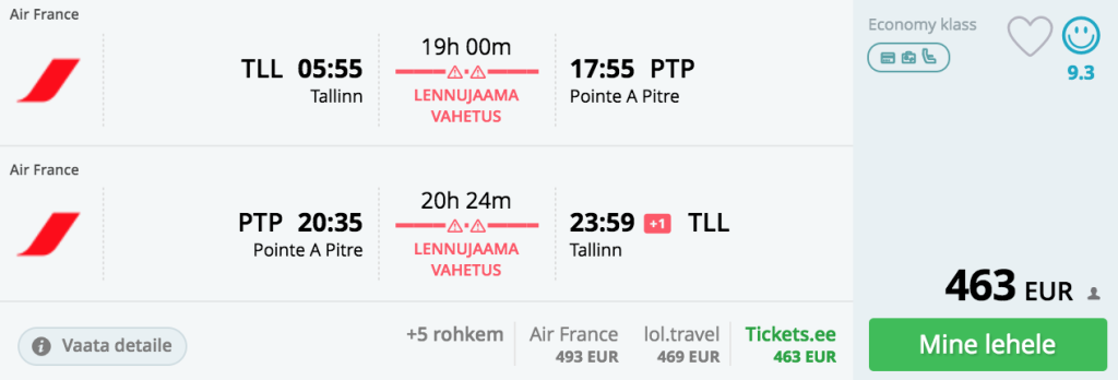 Air France koostöös airBalticuga pakuvad hetkel väga hea hinnaga lennupileteid Kariibidel asuvale Guadeloupe saarele. Kuupäevavalik on väga suur, tõime mõned näited. Parim saadavus on aprillist kuni juuni lõpuni ning alates augusti lõpust kuni oktoobri keskpaigani. Hinnas sisaldub toitlustamine pardal ning äraantav pagas!