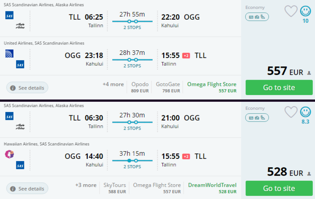 Hetkel on leitavad väga soodsad lennupiletid Tallinnast Hawaiile, Maui saarele! Edasi- tagasi lennupiletid on saada hinnaga al 528€. Rohke valik lennukuupäevi jaanuari lõpust maini ning septembrist novembrini. Enamike lennukuupäevade puhul toimub pikem peatus tagasiteel San Franciscos või Los Angeleses (NB: suur enamik väljaotsitud lennukuupäevadest EI eelda ühtegi ööbimist). Momondos esimesena kuvatav hind ei pruugi olla parimate ümberistumistega. Jälgi meie poolt väljaotsitud hinda ning leia vastav pilet Momondost! Soodsad lennupiletid leiad läbi momondo.co.uk või kasuta otselinke allpool.