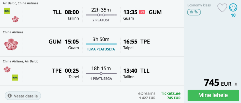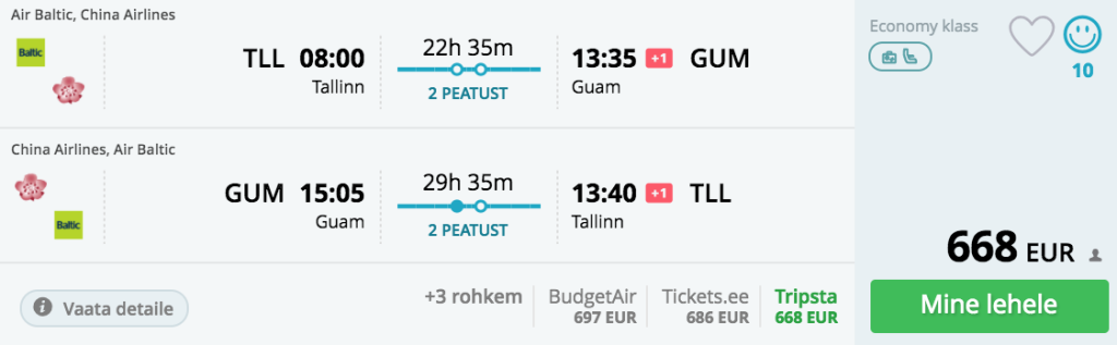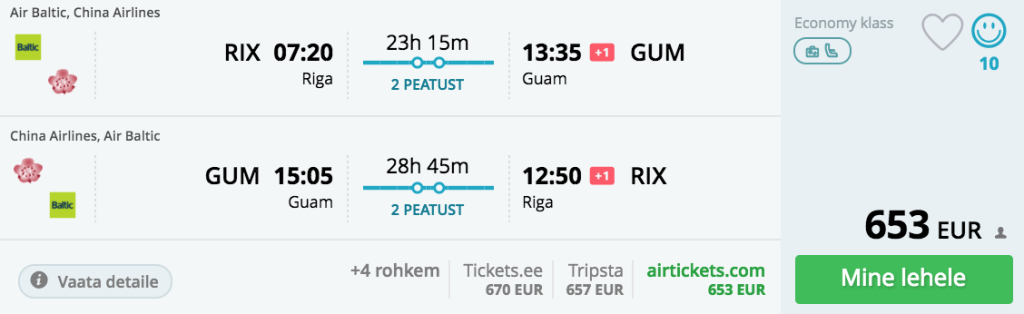 ####KÜLASTA ÜHEL REISIL NII GUAMI KUI TAIWANISoodsa hinnaga lennupileteid leidub ka Riiast. Lennupiletite otsimiseks kasuta Momondos "mitu-sihtkohta" otsingut.Tallinn-Guam-Taipei-Tallinn alates 745€