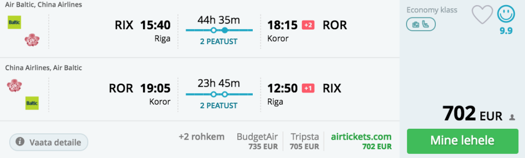 China Airlines (Taiwani lennufirma) pakub hetkel vägagi atraktiivsete hindadega lennupileteid Mikroneesiasse. Edasi-tagasi lennupiletid Guami on Tallinnast ja Riiast saadaval alates 653€ ning Riiast Palausse alates 702€ eest. Saadavust leiab selleks kevadeks. Lennud toimuvad üle Viini, Londoni või Amsterdami. Samuti on võimalik ühel reisil külastada nii Guami või Palaud kui Taiwani. Tõime ka sellekohase näite. Parima hinnaga lennupiletid leiad üles läbi Momondo.ee