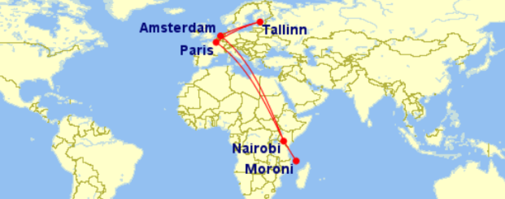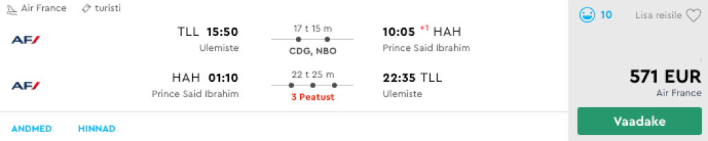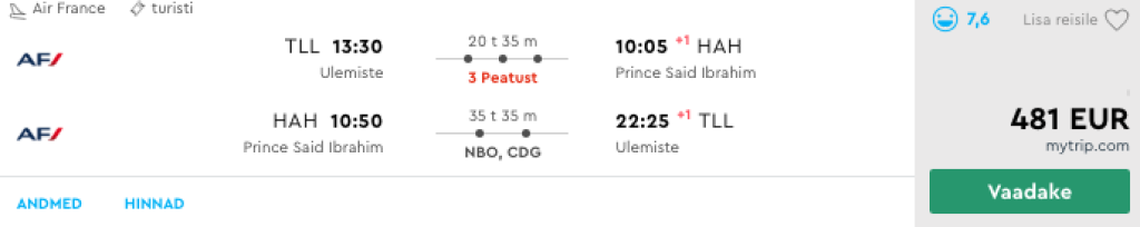 KLM/Air France koostöös Kenyan Airwaysiga pakuvad hetkel väga hea hinnaga lennupileteid Tallinnast Komooridele. Edasi-tagasi lennupiletid on saadaval alates 481€ eest ning kõikidel meie poolt välja otsitud lennupiletitel jäävad hinnad alla 700€. Miinuseks on enamjaolt tulenevalt lennuplaanist pikemad ümberistumised kas siis Amsterdamis või Nairobis, aga leiab ka kiirete ümberistumistega lende. Kui Amsterdami puhul saab minna päevasel ajal linna avastama, siis Nairobi puhul on meie soovitus veeta aega mõnes Nairobi lennujaamas asuvas Lounges või teha transiitviisa ja külastada Keenia pealinna. Toome allpool välja vaid mõned näidiskuupäevad, saadavust leiab ka teistel kuupäevadel. Otsi endale sobivad lennupiletid läbi Momondo.ee