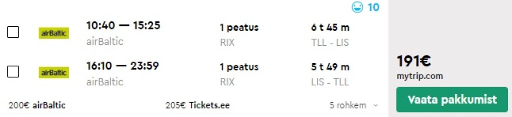 Hetkel on saadaval hea hinnaga lennud airBalticuga Lissaboni! Edasi-tagasi lennupiletid Tallinnast on saadaval alates 191€ eest ning valikus on soodsaid lennupileteid 2020. aasta alguseks. NB: valikus ka lennukuupäevi veetmaks pikk nädalavahetus (R-T) Lissabonis. Piletiteni jõudmiseks kliki allolevatel näidiskuupäevadel või kontrolli endale sobivaid kuupäevi läbi momondo.ee..