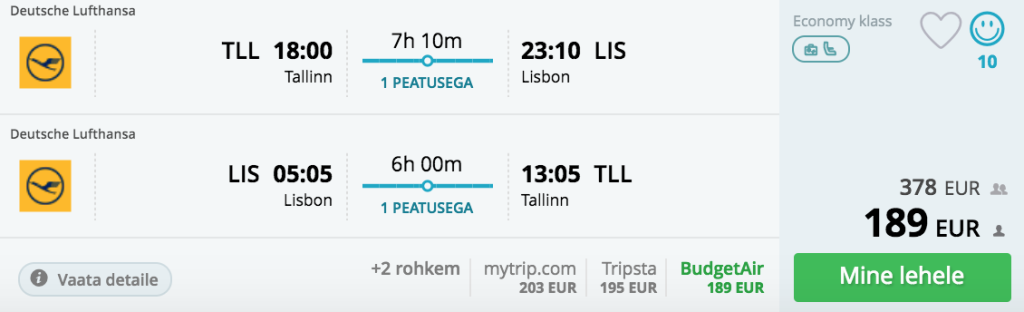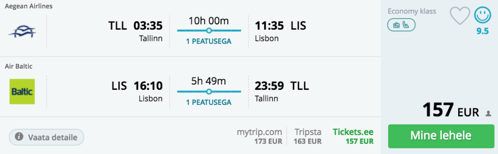 Tallinn-Lissabon-Tallinn alates 157€Lufthansa lennupiletid on 200€ ringis ning Aegani ja airBalticu piletid on saadaval hinnaga 157€.