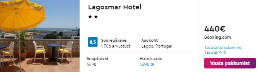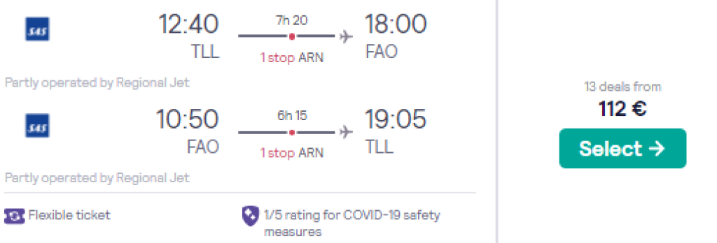 SAS pakub hetkel väga hea hinnaga lennupileteid Lõuna-Portugali. Edasi-tagasi lennupiletid Tallinnast Farosse leiab üles alates 112€ eest ja saadaval on soodsaid lennukuupäevi suvepikendamiseks oktoobris. Lendudel on mõlemal suunal üks ümberistumine Stockholmis. Parima hinnaga lennupiletid leiad üles läbi Skyscanneri. Või kliki allolevatel näidiskuupäevadel.