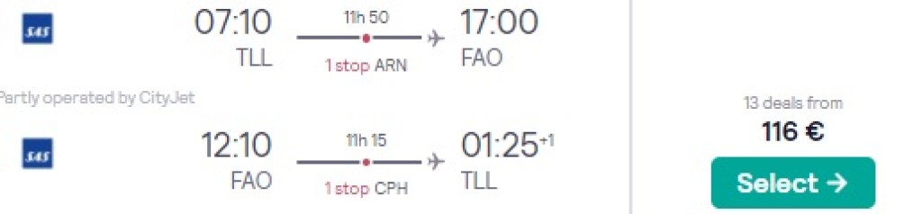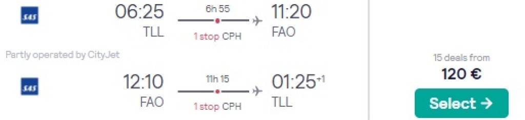 SAS pakub hetkel väga hea hinnaga lennupileteid Lõuna-Portugali. Edasi-tagasi lennupiletid Tallinnast Farosse leiab üles alates 116€ eest ja saadaval on soodsaid lennukuupäevi oktoobris-novembris ja märtsis. Lendudel on mõlemal suunal üks ümberistumine Stockholmis või Kopenhaagenis. Parima hinnaga lennupiletid leiad üles läbi Skyscanneri. Või kliki allolevatel näidiskuupäevadel.