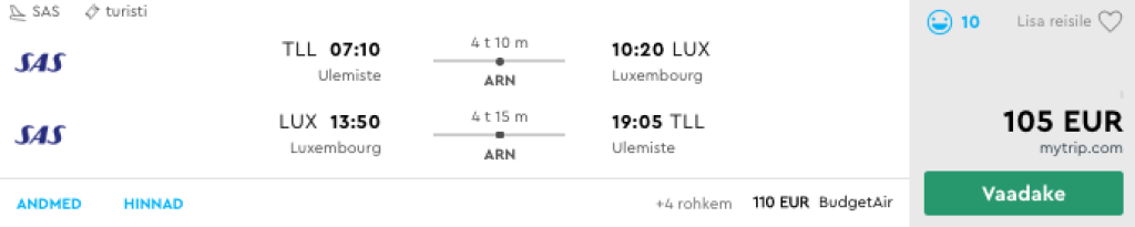 Scandinavian Airlines pakub hetkel suurepärase hinnaga lennupileteid Tallinnast Luksemburgi. Soodsaimad edasi-tagasi lennupiletid leiab üles vaid 105€ eest ning saadavust leiab oktoobri lõpust kuni jaanuari lõpuni. Hea hinnaga lennupileteid leiab ka veetmaks (pikk) nädalavahetus Luksemburgis. Soodsate lennupiletiteni jõudmiseks kliki allolevatel näidiskuupäevadel või otsi endale sobivad lennupiletid läbi Momondo.ee