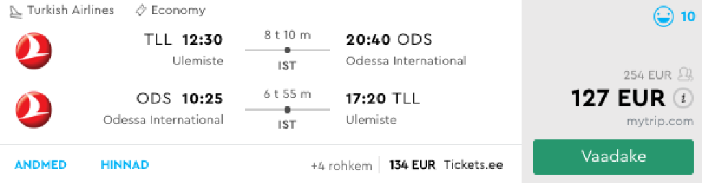 Turkish Airlines pakub hetkel suurepärase hinnaga lennupileteid Tallinnast Musta mere äärsesse Odessasse. Edasi-tagasi lennupiletid Tallinnast Odessasse leiab üles alates 127€ eest. Lennud on ühe kiire ümberistumisega Istanbulis ning lennupiletite hinna sees on ka äraantav pagas. Saadavust leiab alates septembri keskpaigast kuni juuni alguseni välja. Soodsa hinnaga lennupileteid leiab ka kevadiseks koolivaheajaks. Parima hinnaga lennupiletid leiad üles otsides läbi Momondo.ee