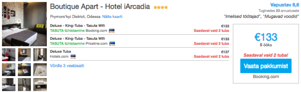 ####SEPTEMBRIS 4 PÄEVANE PUHKUS ODESSAS KOKKU 194€/inToome tripikateni välja ka soodsa võimaluse veetmaks septembris nelja päevane puhkus Odessas. Valisime näidiskuupäevadeks 23.09-28.09 kus lennupiletid hinnaga 127€ leiad SIIT. Parima hinnaga hotellipakkumised leiad üles läbi hotellihindade võrdlusportaali HotelsCombined.ee