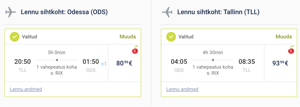 Hetkel võib leida hea hinnaga lennupileteid pikendamaks suve Musta mere äärses Odessas. Soodsa hinnaga lennupileteid pakuvad nii LOT ja ka airBaltic. Lennud airBalticuga Tallinnast Odessasse on saadaval 175€ eest ning Lotiga alates 127€ eest. AirBalticu lennupiletid on saadaval juba lendudele alates augusti lõpust kuni oktoobri lõpuni, LOTiga leiab soodsa hinnaga lennupileteid augustist kuni novembrini. airBalticu lennupiletid leiab soodsaimalt üles otse airBaltic.com ning LOTi omad otsides läbi Skyscanneri