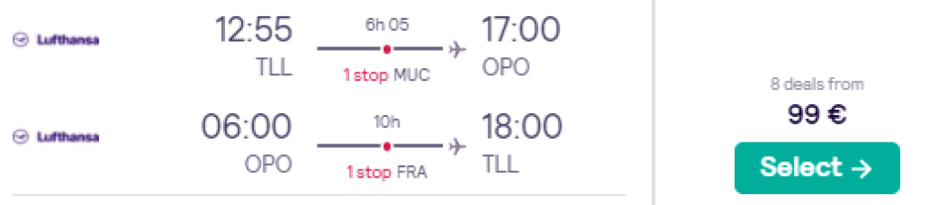 Lufthansa koostöös SWISSiga pakuvad hetkel vägagi soodsa hinnaga lennupileteid Tallinnast Portosse. Edasi-tagasi lennupiletid Tallinnast on saadaval alates 99€ eest ning hea hinnaga lennupileteid leiab alates jaanuarist kuni järgmise aasta sügiseni välja. Parima hinnaga lennupiletid leiad läbi Skyscanneri, kui soovid lennupiletid osta otse lennufirmalt vaid paarkümmend eurot kallimalt, siis mine Lufthansa.com ja sisesta soovitud lennukuupäevad otsingusse (hinnad alates 111€).