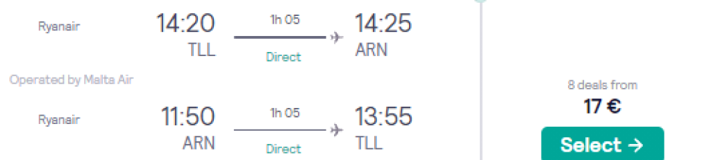 Odavlennufirma Ryanair pakub hetkel väga soodsa hinnaga lennupileteid otselendudele Stockholmi. Edasi-tagasi lennupiletid Tallinnast on saadaval alates 17€ eest ning soodsa hinnaga lennupileteid leiab novembris-detsembris. Lennupiletiteni jõudmiseks kliki allolevatel lennukuupäevadel või kontrolli endale sobivaid läbi Skyscanneri.