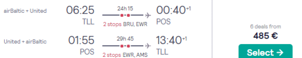 United koostöös airbalticu ning Lufthansaga pakuvad hetkel hea hinnaga lennupileteid Tallinnast Trinidad ja Tobagole. Edasi-tagasi lennupiletid Tallinnast Port of Spaini leiab üles alates 485€ eest ning soodsa hinnaga lennupileteid leiab jaanuarist märtsini. Tulenevalt lennuplaanist on tagasiteel 12h pikkune ümberistumine New Yorkis. Lennupiletite hinna sees on nii äraantav pagas kui toitlustamine. Lennupiletite ostmiseks kliki allpool olevatel näidiskuupäevadel või otsi endale sobivad lennupiletid üles läbi Skyscanneri