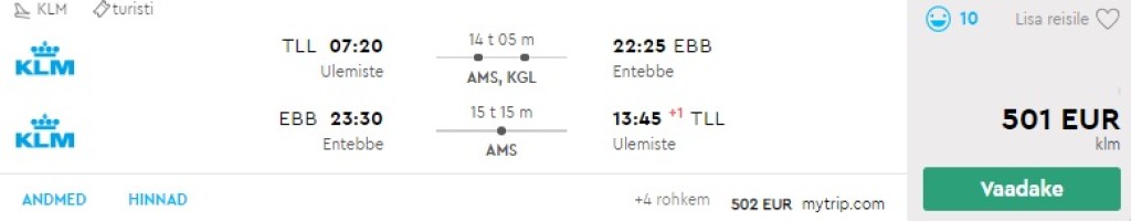 KLM pakub hetkel hea hinnaga lennupileteid Tallinnast Ugandasse. Edasi-tagasi lennupiletid on saadaval alates 501€ eest ning saadavust leidub septembrist veebruarini. Piletiteni jõudmiseks kliki allolevatel näidiskuupäevadel või kontrolli endale sobivaid kuupäevi läbi momondo.eeLennupiletite hinna sees on nii äraantav pagas kui toitlustamine lennuki pardal.