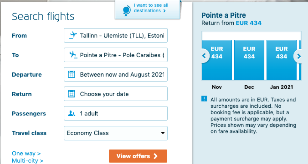 Piletiteni jõudmiseks soovitame esmalt otsida lennupiletid üles KLMi koduleheküljelt, kus need maksavad alates 434€ ning kui soovid säästa veel 2-30€, siis sisesta leitud kuupäevad Skyscannerisse
