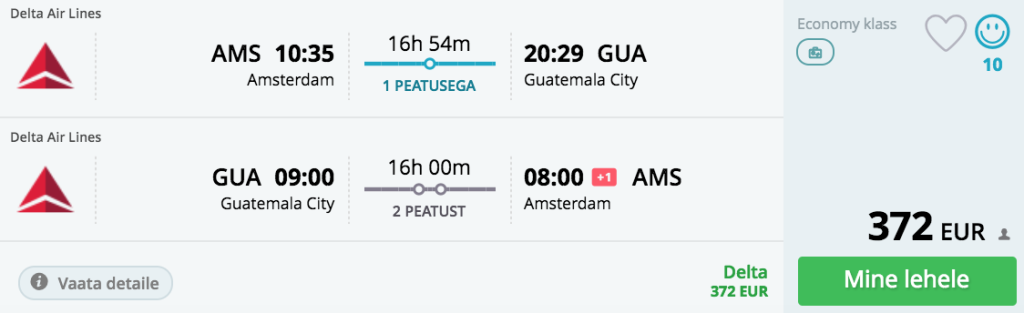 Amsterdam-Guatemala City-Amsterdam alates 372€Tasub jälgida ümberistumiste pikkuseid. Tallinnast lendamiseks on sobilikumad variandid pealelõunastel lendudel, mis on vaid mõnevõrra kallimad.