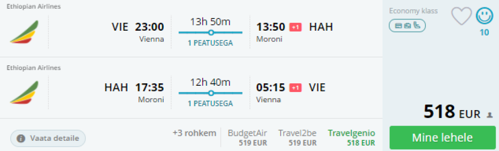 Ethiopian pakub hetkel väga hea hinnaga lennupileteid Viinist Komoori saartele! Edasi-tagasi lennupiletid on saadaval alates 518€ eest. Ohtralt soodsa hinnaga lennupileteid leidub veebruari lõpust kuni novembrini välja. Sinna juurde sobituvad ilusti airBalticu edasi- tagasi lennupiletid Tallinnast Viini, mille hinnad algavad 117 eurost.